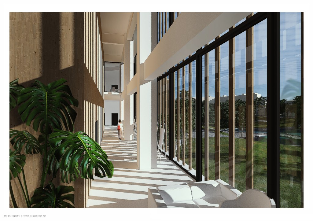 The north wing is built on top of the old public swimming pool, now out of order, that would be converted into an open, freely accessible amphitheater, summoning the memory of the preexisting one, overgrown and forgotten. Surrounded by nature, in an almost classical sense, yet usefully connected to the conference hall and media rooms of the upper floors, such a space would not only be an attraction spot for public gatherings, but also a facilitator of educational activities, an extension of the spaces designated to the multiple schools in walking distance.